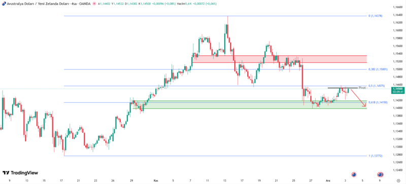 Parite, 1.1450-1.1460 bölgesindeki 0.5 Fibonacci düzeltmesi ve kısa vadeli pivot direncini test ettikten sonra zayıflama sinyalleri veriyor. Fiyat bu bölge üzerinde kalıcılık sağlayamadığı için mevcut seviyelerden aşağı yönlü bir tepki verme ve yeniden düzeltmeye geçme olasılığı yüksek görünüyor. Aşağı yönde ilk hedef 1.1415 seviyesindeki 0.618 Fibonacci bölgesi olup, bu alan aynı zamanda güçlü bir talep bölgesi niteliğini koruyor.