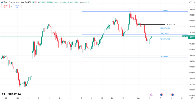 Fiyat, son düşüşün ardından %61.8 Fibonacci seviyesi olan 176.35 bölgesinde destek buldu. Bu alan, alıcıların yeniden devreye girdiği önemli bir teknik eşik konumunda. Fiyatın bu seviyenin üzerinde tutunması halinde kısa vadede 176.82 ve 177.29 dirençlerine doğru bir toparlanma hareketi beklenebilir. 177.29 üzerinde kalıcılık sağlanırsa, yükseliş momentumunun güçlenmesi ve fiyatın 177.71 pivot bölgesine doğru ilerlemesi olası.