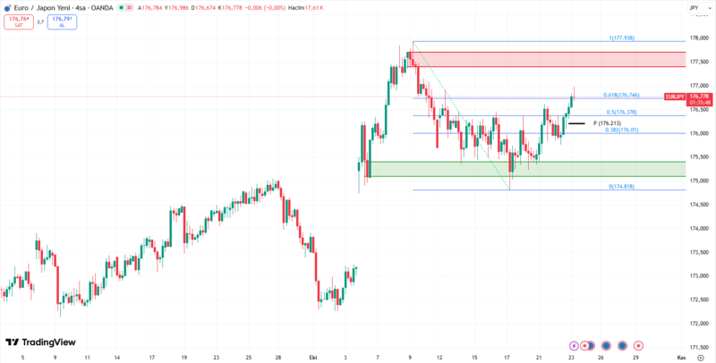 Fiyatın 176.213 pivot seviyesinin altına geri çekilmesi durumunda kısa vadeli momentum zayıflayabilir. Bu durumda 176.01 (%38.2 Fibonacci) seviyesi ilk destek olarak izlenecek; bu seviyenin de kırılması hâlinde fiyatın 174.818 desteğine ve önceki dip alanına doğru gerilemesi olası.