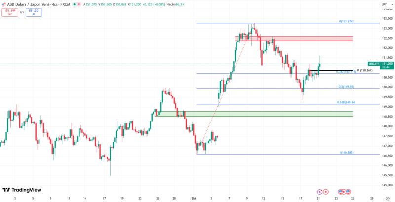 Fiyat, 146.585 seviyesinden başlayan yükselişin ardından geri çekildi ve 150.70 seviyesindeki %38,2 Fibonacci seviyesi ile 150.80’deki Pivot bölgesini test ediyor. Bu kritik eşik üzerinde kalıcılık sağlanırsa, yükseliş hareketi bir sonraki direnç bölgesi olan 152.00-152.30 ve ardından 152.50-53.00 seviyelerine doğru devam edebilir. Bu alanlar, geçmişte satış baskısının arttığı kritik direnç bölgeleri olarak öne çıkıyor.