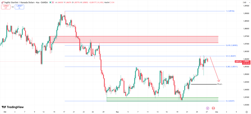 Parite, 1.8620 seviyesindeki %50 Fibonacci düzeltmesi ile uyumlu olan kısa vadeli direnç bölgesini test ettikten sonra zayıflama sinyalleri veriyor. Ayrıca fiyatın üzerinde yer alan 1.8690-1.8750 aralığındaki geniş kırmızı arz bölgesi hâlâ güçlü bir satış alanı niteliğini koruyor. Bu nedenle fiyatın mevcut seviyelerden aşağı yönlü tepki vermesi ve düzeltmeye geçmesi olasılığı yüksek görünüyor. Aşağı yönlü ilk hedef 1.8550 (%38.2 Fibonacci) olurken, ana beklenti 1.8460 civarındaki pivot desteğinin yeniden test edilmesi yönünde.
