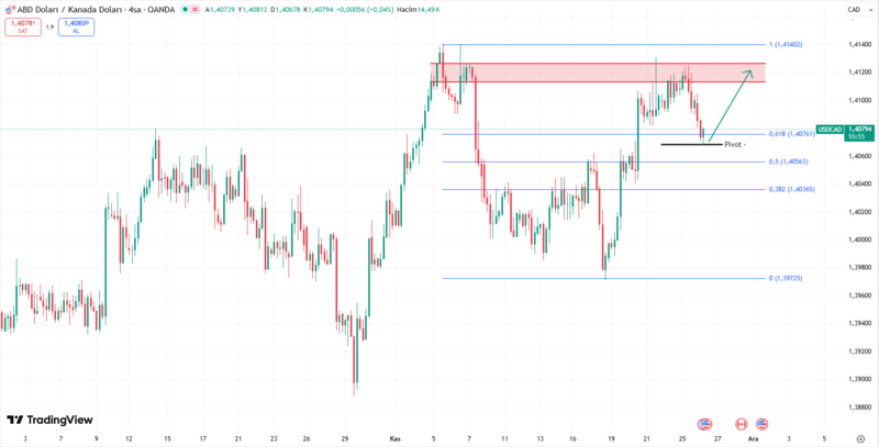 Fiyat, 1.4076 seviyesindeki %61.8 Fibonacci düzeltmesi ile çakışan pivot bölgesini test ediyor. Bu bölge üzerinde tutunma devam ederse, paritede kısa vadeli yukarı yönlü yapının güçlenmesi beklenebilir. Yukarı yönlü senaryoda ilk hedef 1.4120–1.4135 aralığındaki kırmızı direnç bloğu, daha üstte ise 1.4140 seviyesi (önceki tepe) bulunuyor. Bu bölgeye doğru bir hareket, fiyatın yeniden güçlü satış bölgesine yöneldiğini doğrulayabilir.